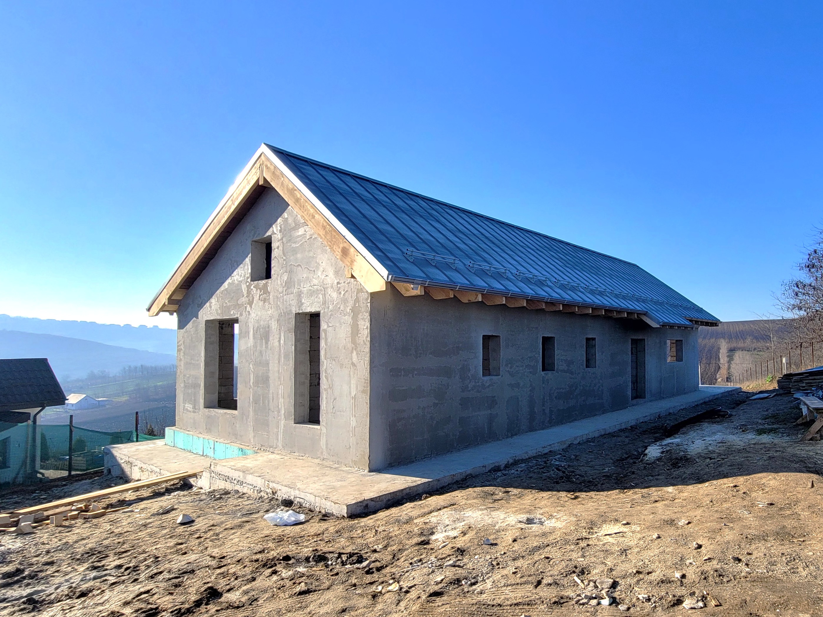 Casa este în execuție, aproape de finalizarea fazei la roșu.