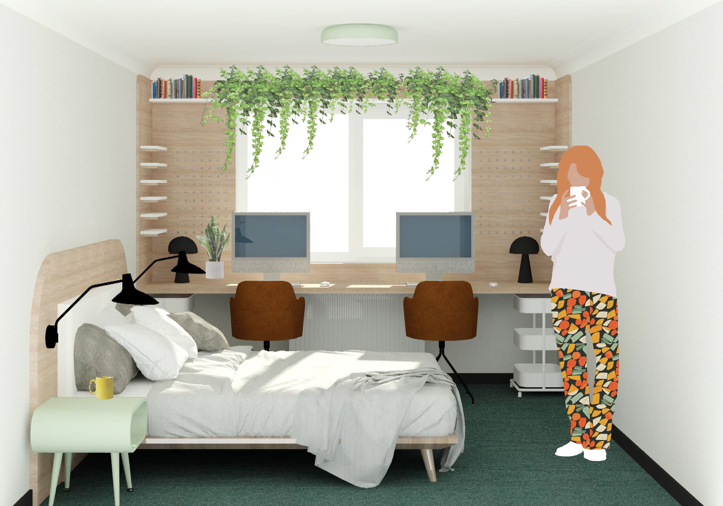Zona ferestrei este îmbrăcată de un obiect custom cu pegboard și polițe, în care Ilinca și Daniel pot lucra în liniște, cu priveliște spre curte.